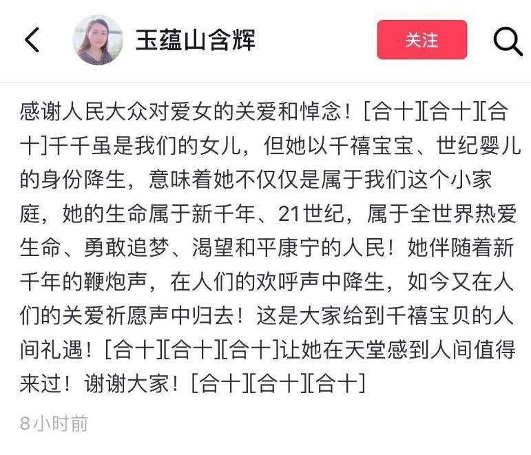 在悲痛之中,千千的妈妈在3月24日发布了千千去世的讣告,讣告中写道:她伴随着新千年的鞭炮声,在人们的欢呼声中降生,如今又在人们的关爱祈愿声中归去。这是大家给到千禧宝贝的人间礼遇。让她在天堂感到人间值得来过。